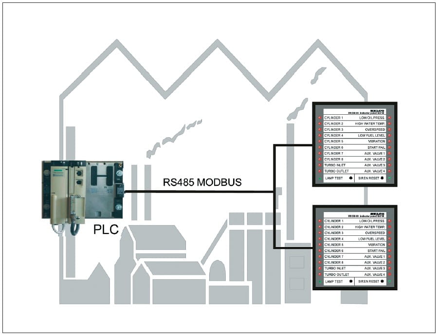 Panel sygnalizacyjny 20-kanałowy do monitorowania sygnałów ze styków beznapięciowych lub sygnałów przesyłanych za pomocą 2-przewodowej linii RS485 z użyciem protokołu MODBUS-RTU. Komunikacja MODBUS umożliwia przesyłanie informacji o stanie diod LED i wejść stykowych panelu, co pozwala na współpracę ze sterownikami programowalnymi PLC.