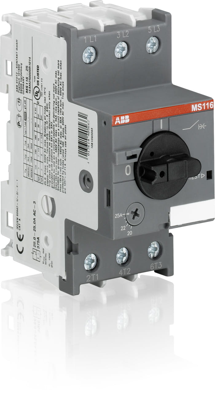 Wyłącznik silnikowy MS116-12 to kompaktowe urządzenie o szerokości 45 mm o znamionowym prądzie roboczym Ie = 12.0 A Urządzenie to służy do ręcznego włączania i wyłączania silników, jednocześnie chroniąc je (bez stosowania dodatkowych bezpieczników) przed zwarciem, przeciążeniem i złą kolejnością faz. Wyłącznik silnikowy zapewnia zdolność wyłączania zwarciowego Ics = 25 kA przy 400 VAC i klasę wyzwalania 10A. Inne jego cechy to kompensacja temperaturowa i obrotowy uchwyt z wyraźnym wskazaniem pozycji przełącznika. Wyłącznik silnikowy MS116 przeznaczony jest do zabezpieczenia silników trój- i jednofazowych. Do wyłącznika producent – firma ABB – oferuje cały zestaw dodatkowych akcesoriów: