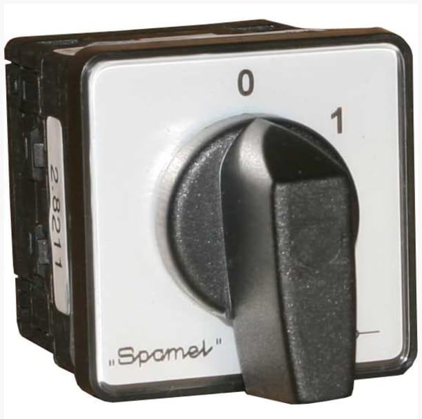 SK16-2.8380\P03 Łącznik krzywkowy 16A, Rozłącznik 1-0-2 (45st), 2-biegunowy, mocowany do pulpitu, czoło szare, pokrętło czarne, IP65
